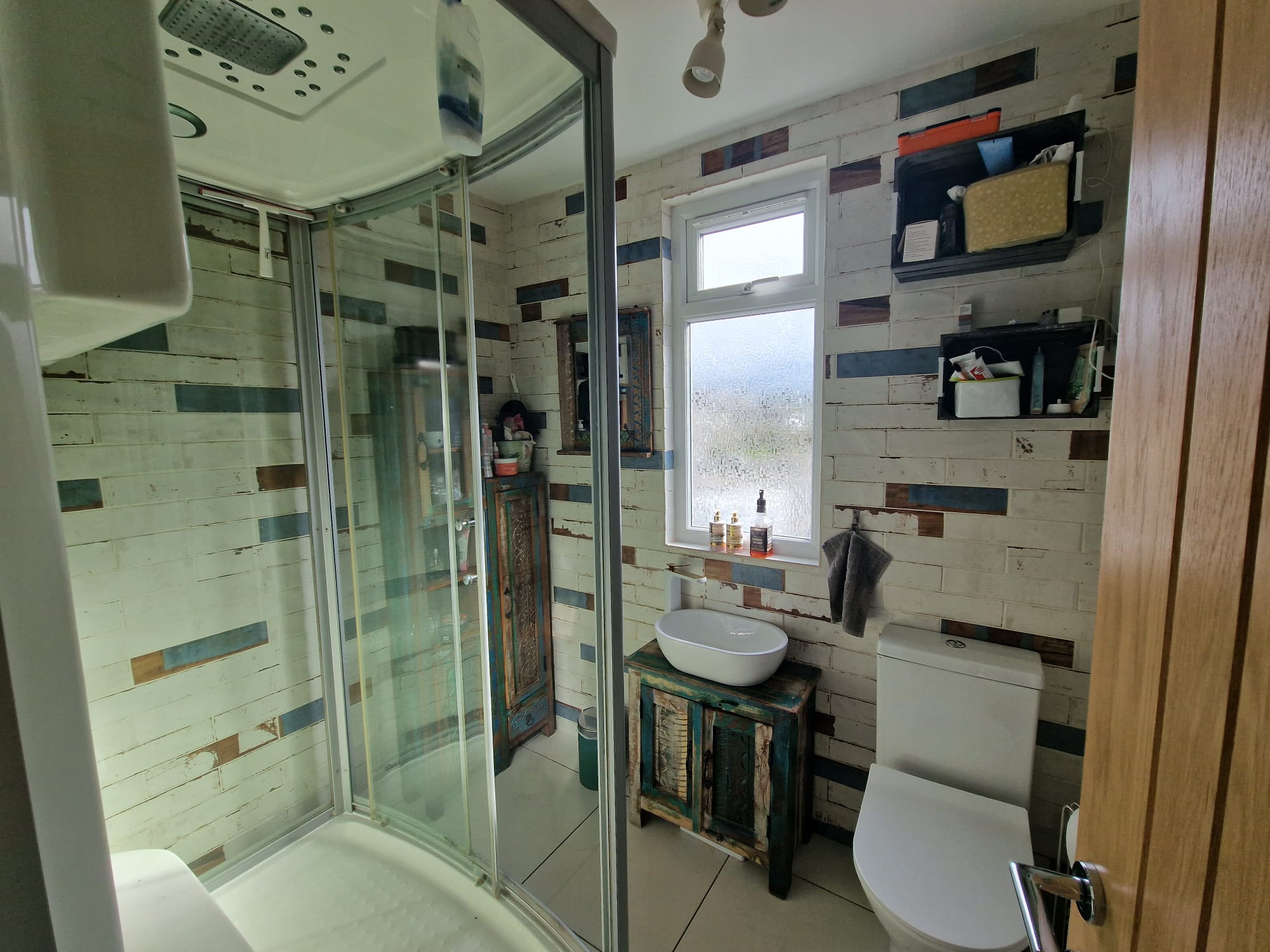 • Fully tiled bathroom with an incredible shower and a built-in sauna, hand basin, WC, and wall mounted radiator.