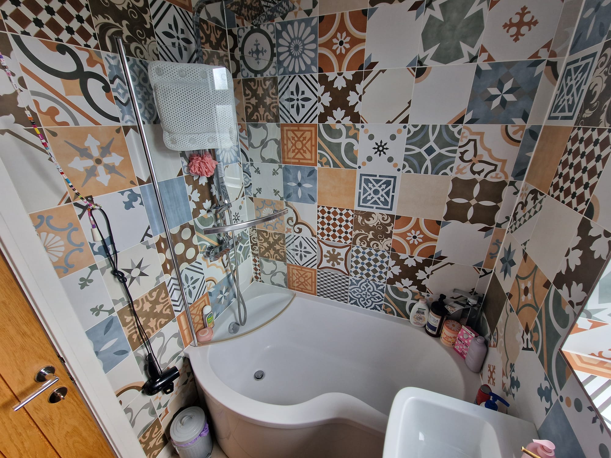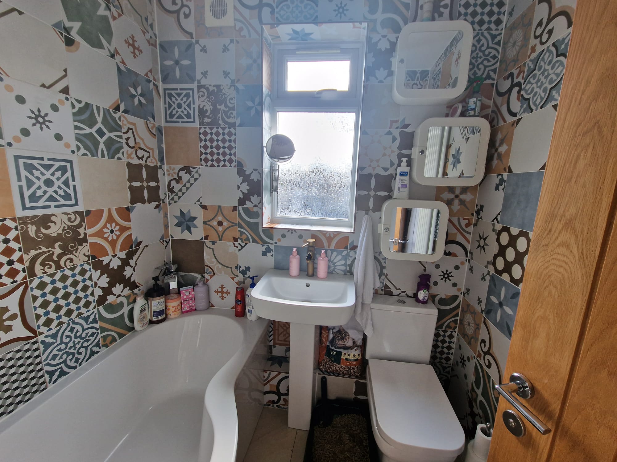 • Fully tiled family bathroom with a shower over the bath, hand basin, and WC and wall-mounted radiator.