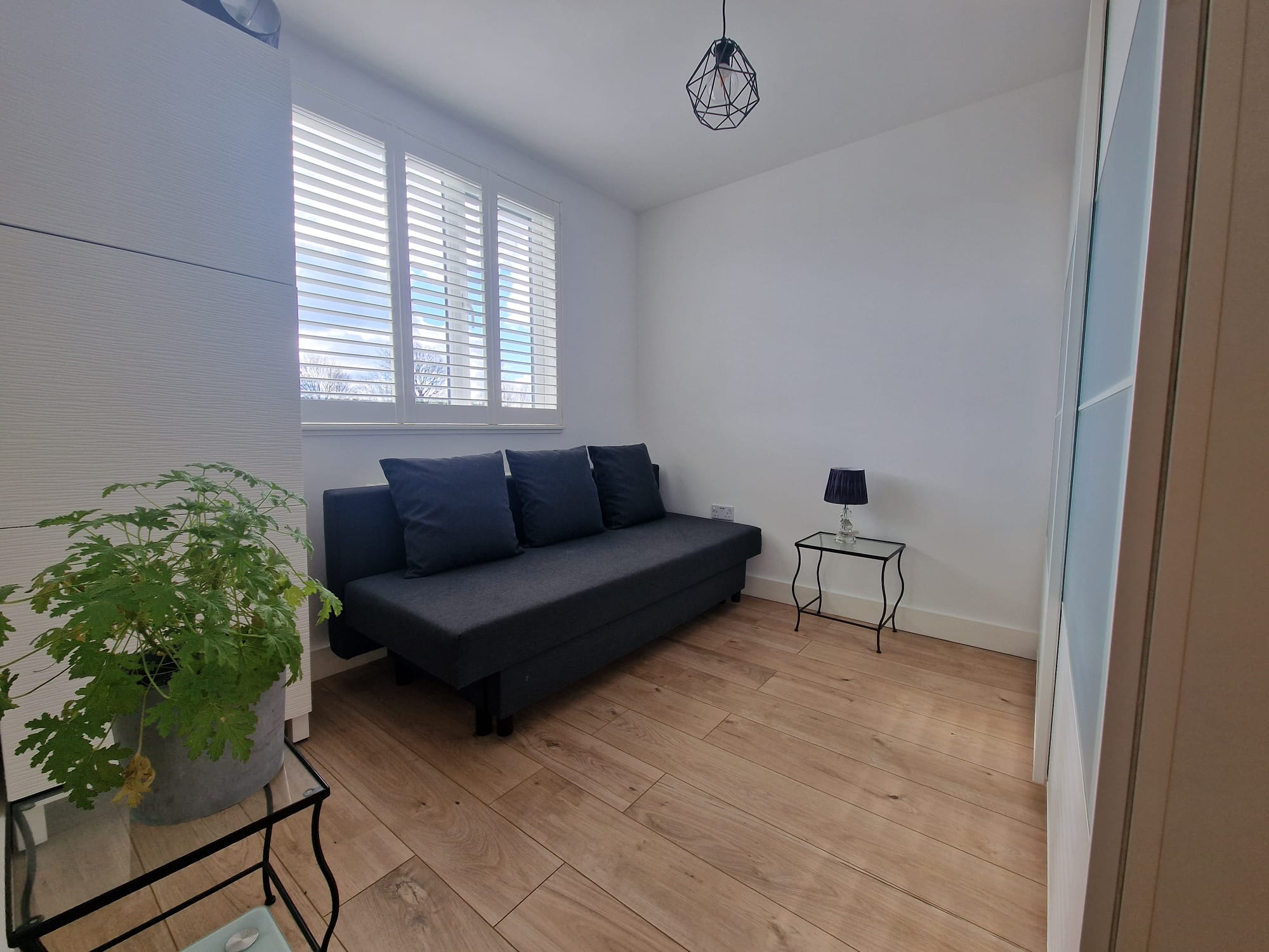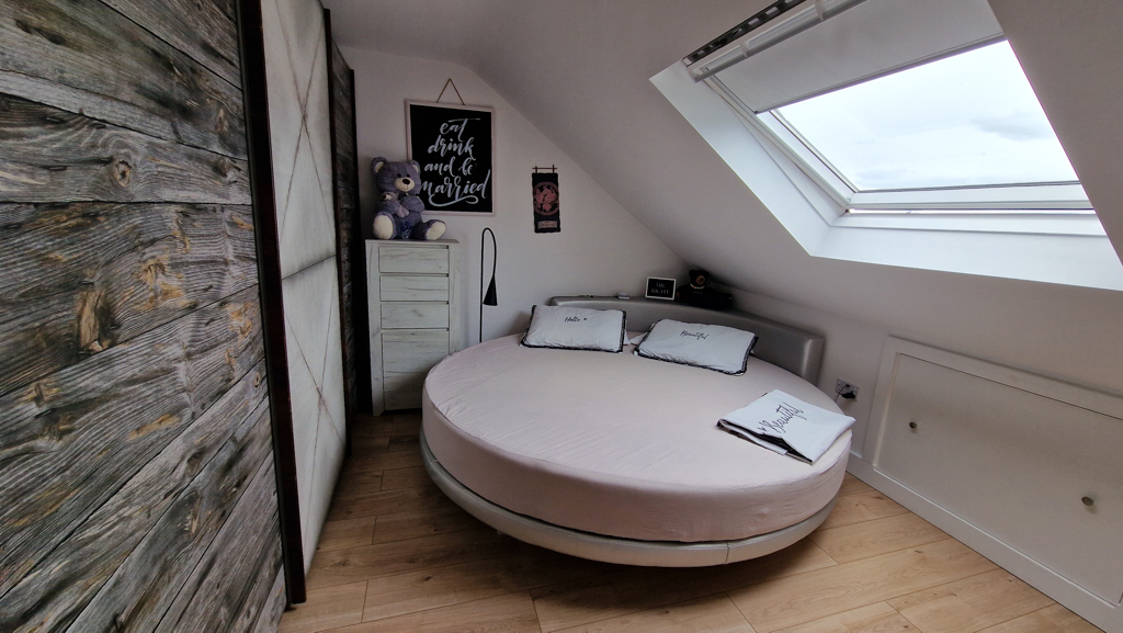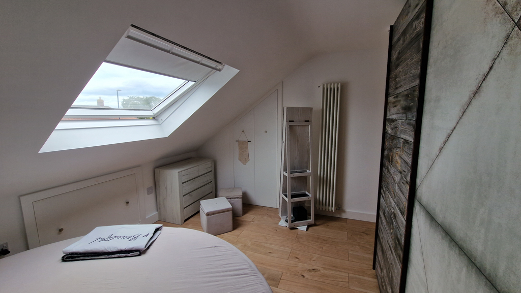 • One bedroom with a roof window and the second bedroom with a standard double-glazed window, windows shutters, wall-mounted radiators, and laminate floor. Bedrooms have good size with plenty of space for storage.