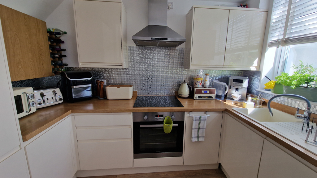 • Kitchen: Compact yet functional, the kitchen boasts white high gloss cabinets, a built-in fridge and dishwasher, an electric oven, and an induction cooktop with an extractor fan. Enjoy garden views through the double-glazed window.