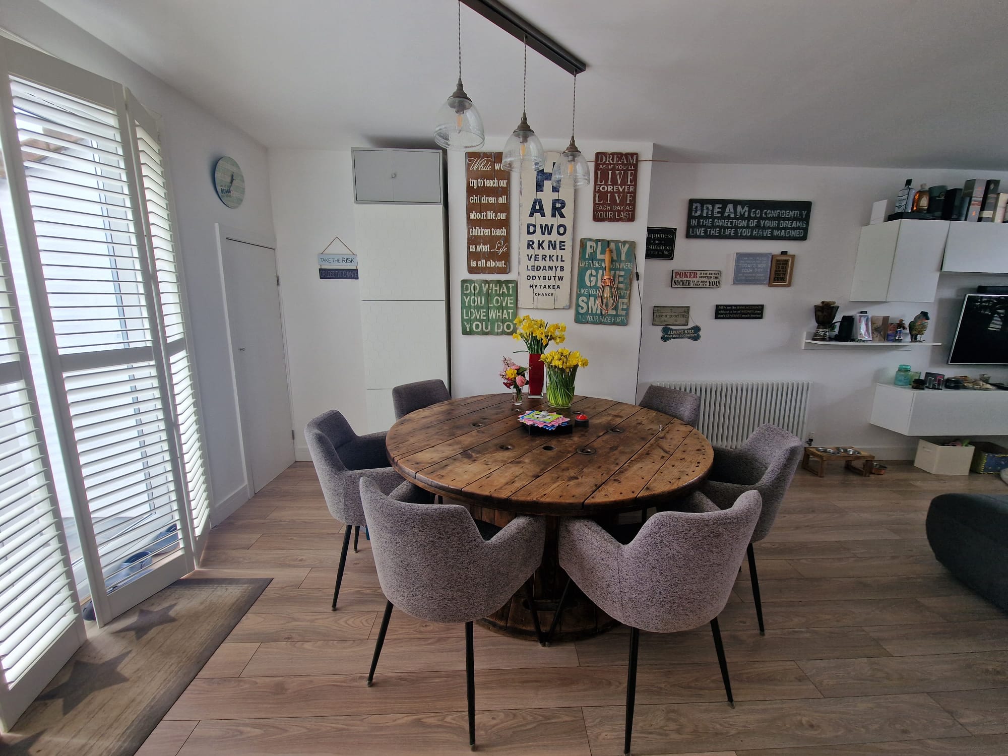 • Dining Room: Perfectly situated between the kitchen and living room, with French doors with shutters offering a view of the garden.